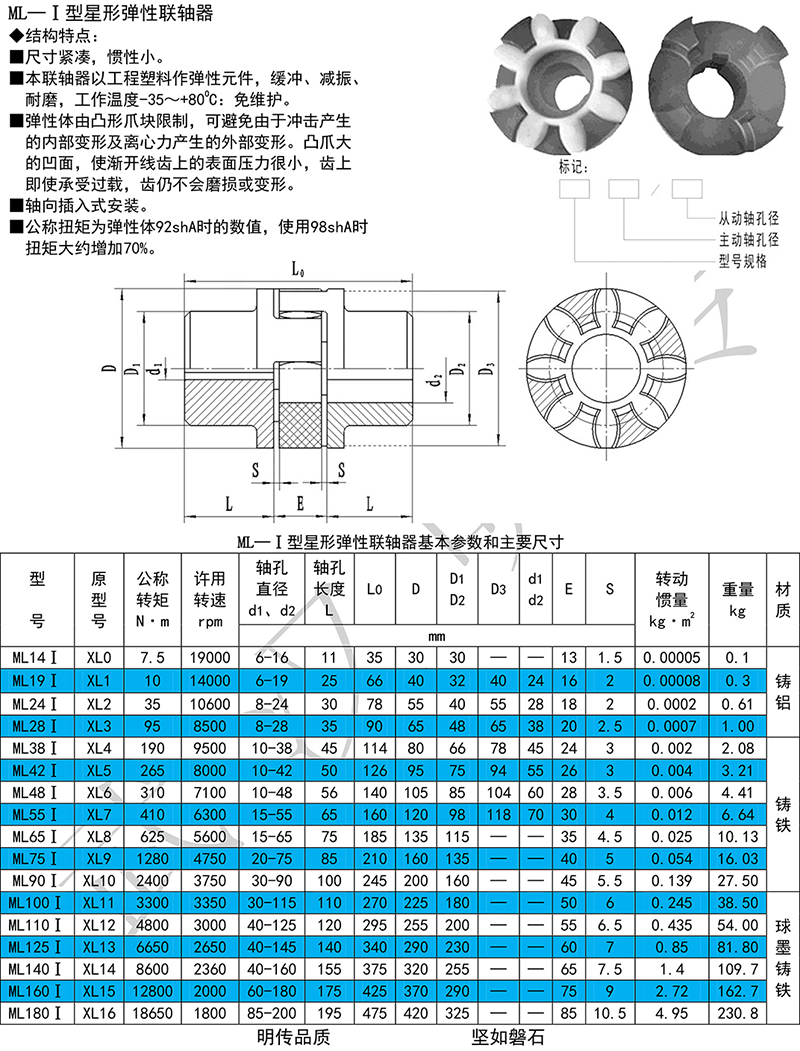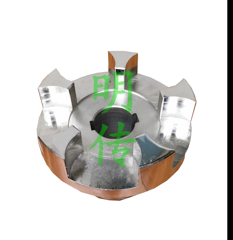 星形彈性聯(lián)軸器是由兩個(gè)帶凸爪形狀相同的半聯(lián)軸器和彈性元件組成,利用星形彈性元件置于兩半聯(lián)軸器凸爪之間,以實(shí)現(xiàn)兩半聯(lián)軸器的聯(lián)接。該聯(lián)軸器的結(jié)構(gòu)與梅花形彈性聯(lián)軸器基本相同,區(qū)別在于彈性元件的形狀分別是星形和梅花形,性能和梅花形彈性聯(lián)軸器相同,具有一定補(bǔ)償兩周相對(duì)偏移、減振、緩沖性能,徑向尺寸小、結(jié)構(gòu)簡(jiǎn)單、不用潤(rùn)滑承、載能力高,維護(hù)方便等特點(diǎn)。適于聯(lián)接兩同軸線,起動(dòng)頻繁,正反轉(zhuǎn)多變的傳動(dòng)軸系,傳遞轉(zhuǎn)矩20~25000N·m,工作環(huán)境溫度-35~80℃。
